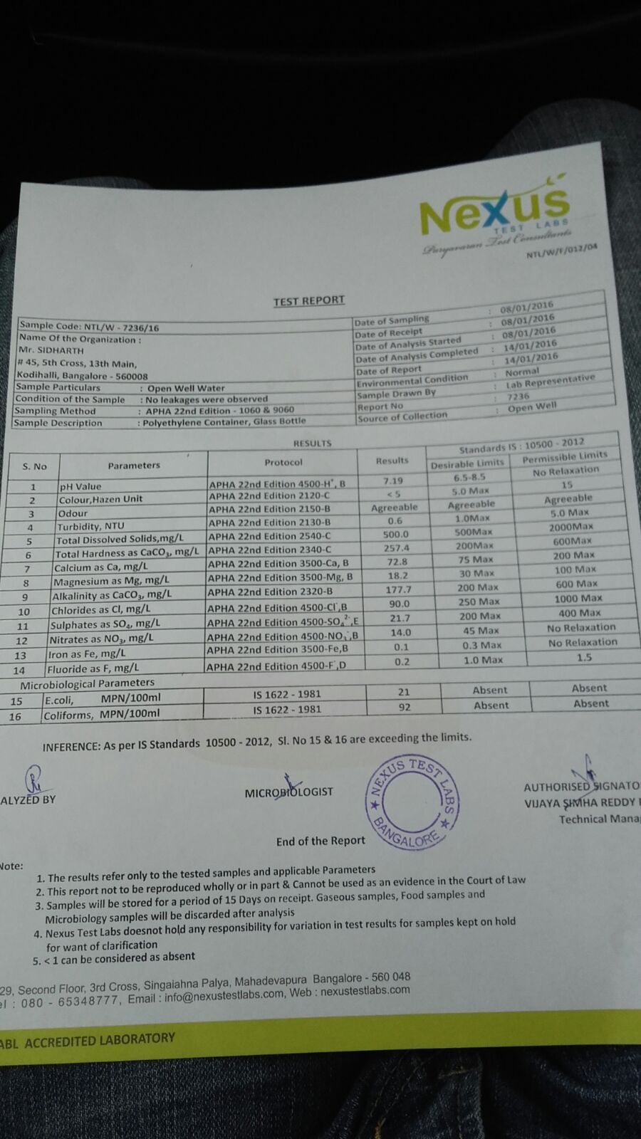 A water quality test was conducted previously, by sampling the water that was accessible from a private dewatering well which was constructed in order to cease the basement seepage problem that the resident was facing. In the below picture, the results of the test are given.